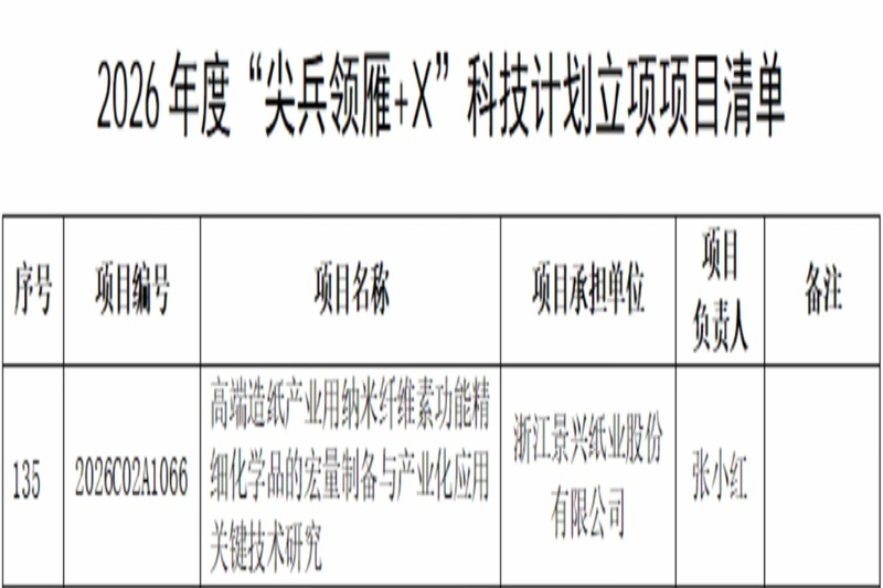 2025年12月30日,經過嚴格篩選,浙江省科學技術廳下達了2026年度“尖兵領雁+X”科技計劃項目,景興紙業承擔的“高端造紙產業用納米纖維素功能精細化學品的宏量制備與產業化應用關鍵技術研究”項目(編號:2026C02A1066)獲批“領雁”項目。
